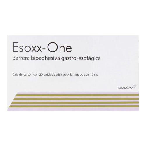 ESOXX-ONE SACHETS. ESOXX-ONE es un dispositivo médico que está indicado en el tratamiento del reflujo gastroesofágico, ya que actúa como un protector de la mucosa esofágica por la acción del ácido gástrico. Presentación en caja con 20 laminados de 10 ml c/u. Por cada Stick laminado contiene: Poloxámero 407, Sulfato de Condroitina de sodio, Xilitol, Polivinilpirrolidona, Hialuronato de sodio, Benzoato de sodio, Sorbato de potasio, saborizante y agua. Fabricado por los laboratorios Alfasigma.